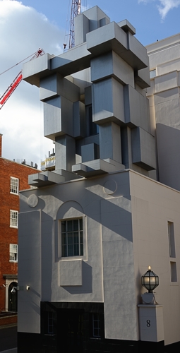 atop the facade of London's new Beaumont hotel, as if it had just
